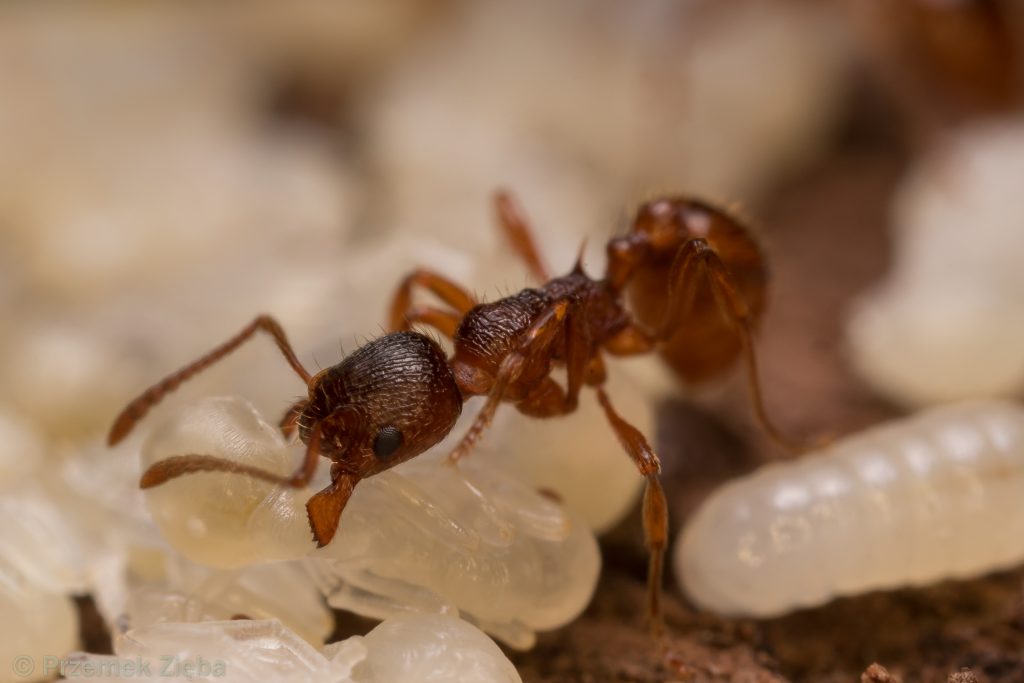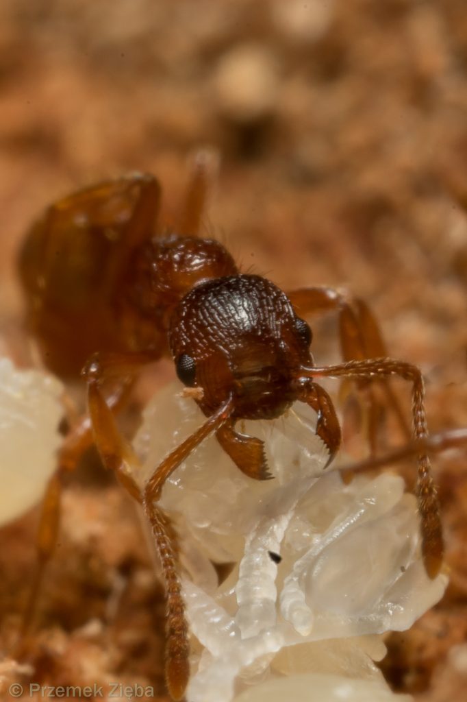 Obiektywy manualne dobrze sprawdzają się w fotografii makro w przypadku fotografowania większych niż mrówki obiektów. Ale oczywiście trudno zaprzeczyć, że można nimi i w przypadku mrówek osiągnąć dobre efekty. Warunkiem jest sytuacja zamrożenia ruchu przez mrówkę, ewentualnie stabilnej sceny jak chociażby połowów przez nie innych owadów, opieki nad gniazdem, konsumpcji napotkanego pokarmu, czy też trofalaksji. Kilka zdjęć poniżej, w ich przypadku zastosowałem obiektyw ultra macro Laowa o odwzorowaniu w tych przypadkach około 3:1