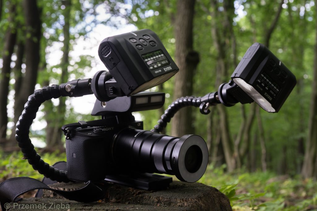 Z obiektywami sprzężony jest problem oświetlenia. Zastosowanie obiektywów manualnych wymusza dobranie ręczne parametrów lampy błyskowej. Oczywiście metodą prób i błędów, dodatkowo próby te przeprowadzane są na ogół bezpośrednio w trakcie wykonywania zdjęcia. Obiektywy o odwzorowanych większych od 1:1 są bardzo ciemne, stąd prócz użycia lamp błyskowych warto pokusić sie o zastosowanie podświetlenia ,,modelującego” scenę fotografowaną. To doświetlenie przyda się bardzo przy często zawodnym focus peakingu, no a w przypadku jego braku pomoże w ustawieniu ostrości.