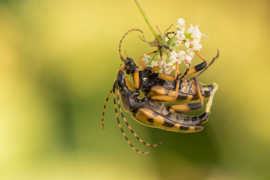 Swego czasu odbierając jakąś nagrodę w konkursie fotograficznym ( za zdjęcie oczywiście owadów) usłyszałem takie stwierdzenie z ust ,,sławnego fotografa”, który był w jury. Uważał, że znacznie trudniej jest zrobić zdjęcie jelenia przechodzącego przez rzekę w tym samym miejscu codziennie, niż zdjęcie przedstawiające kopulujące owady na roślinie, które przy 30 stopniowym upale w nieskoordynowany sposób ,,wiją” się w godowym tańcu. Zdjęcie poniżej.