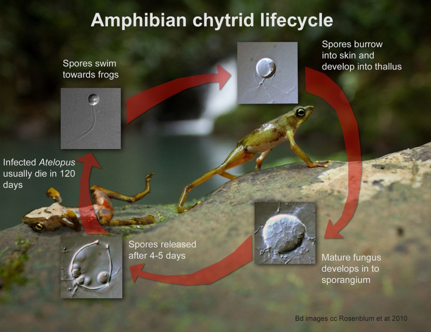 Płazy na całym świecie dziesiątkuje prócz braku wody pasożytniczy grzyb Batrachochytrium dendrobatidis. Grzyb ten powoduje rogowacenie skóry płazów zaburzając oddychanie (większość wymiany gazowej u płazów zachodzi przez skórę) i gospodarkę elektrolitową. Jest to grzyb, którego niestety stwierdzono i w Polsce. Choroba jaka wywołuje to chytridiomikoza. Pozwolę zamieścić poniżej schemat jak przebiega.